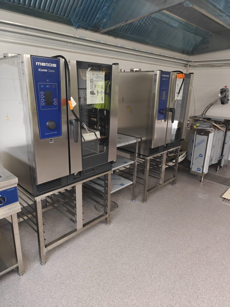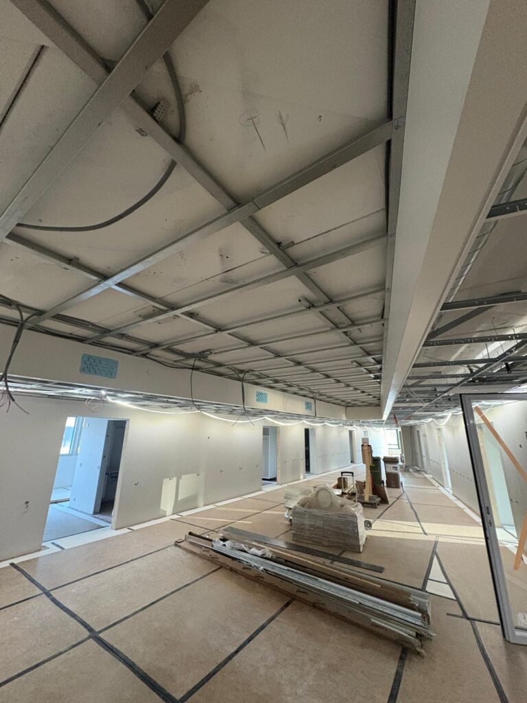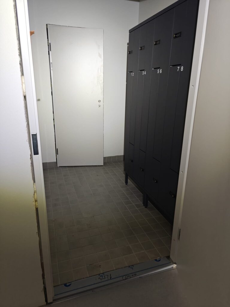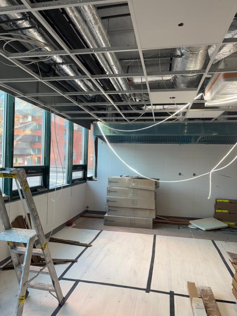 Ensimmäisessä kerroksessa on tehty suurtalouskeittiön ja muiden aputilojen alakattorunkotöitä, jonka jälkeen on päästy asentamaan keittiölaitteita. Myös pukukaapit ovat jo löytäneet paikkansa.