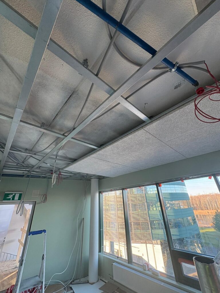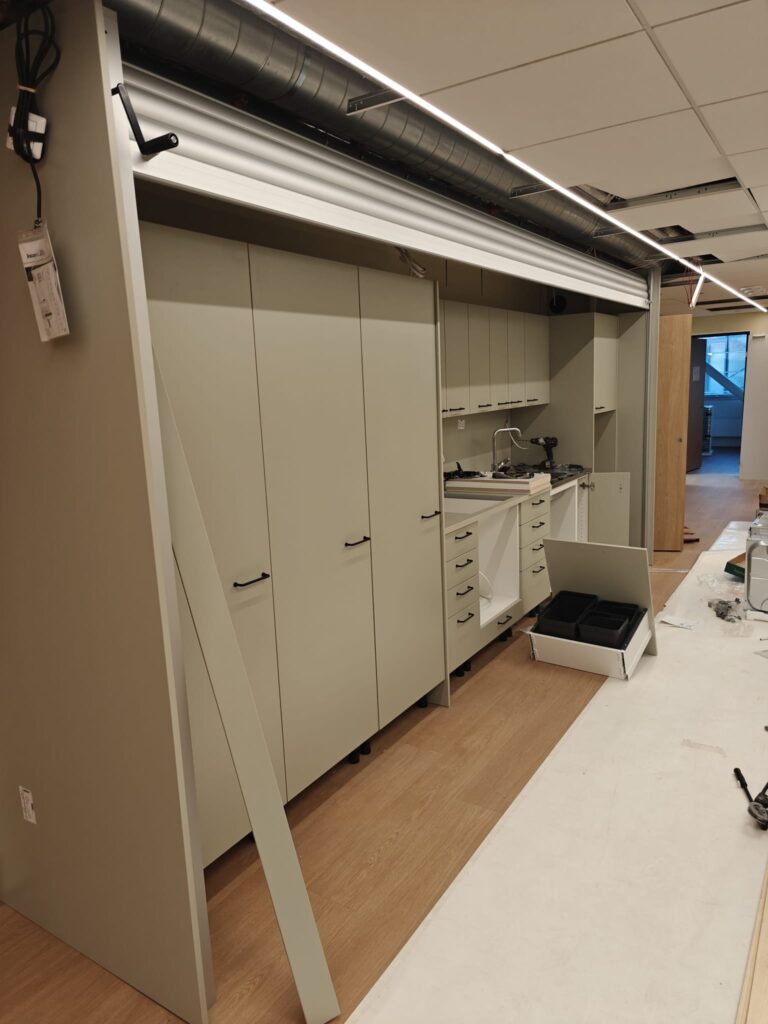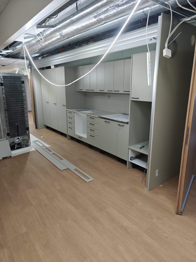 Neljännessä kerroksessa on aloitettu keittiön asennus- ja viimeistelytyöt. Myös listoitus ja korotetun alakaton levytys ovat edistyneet.