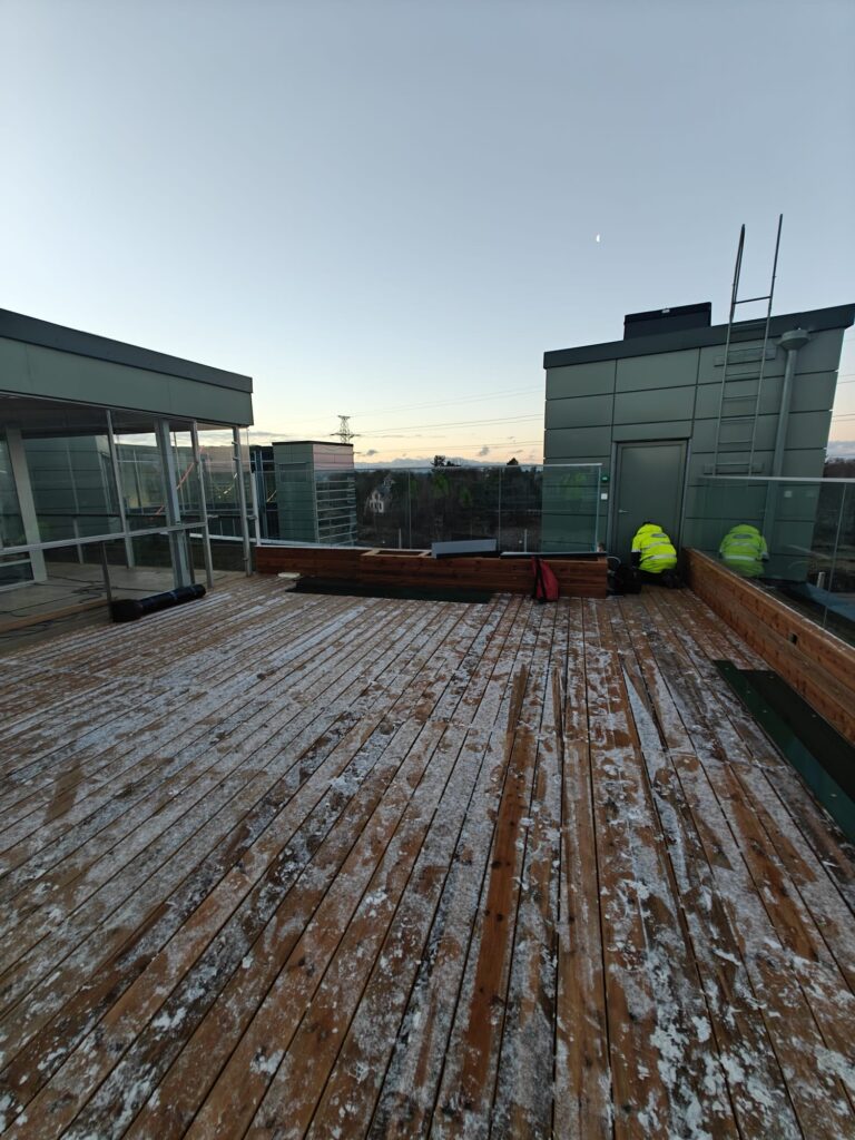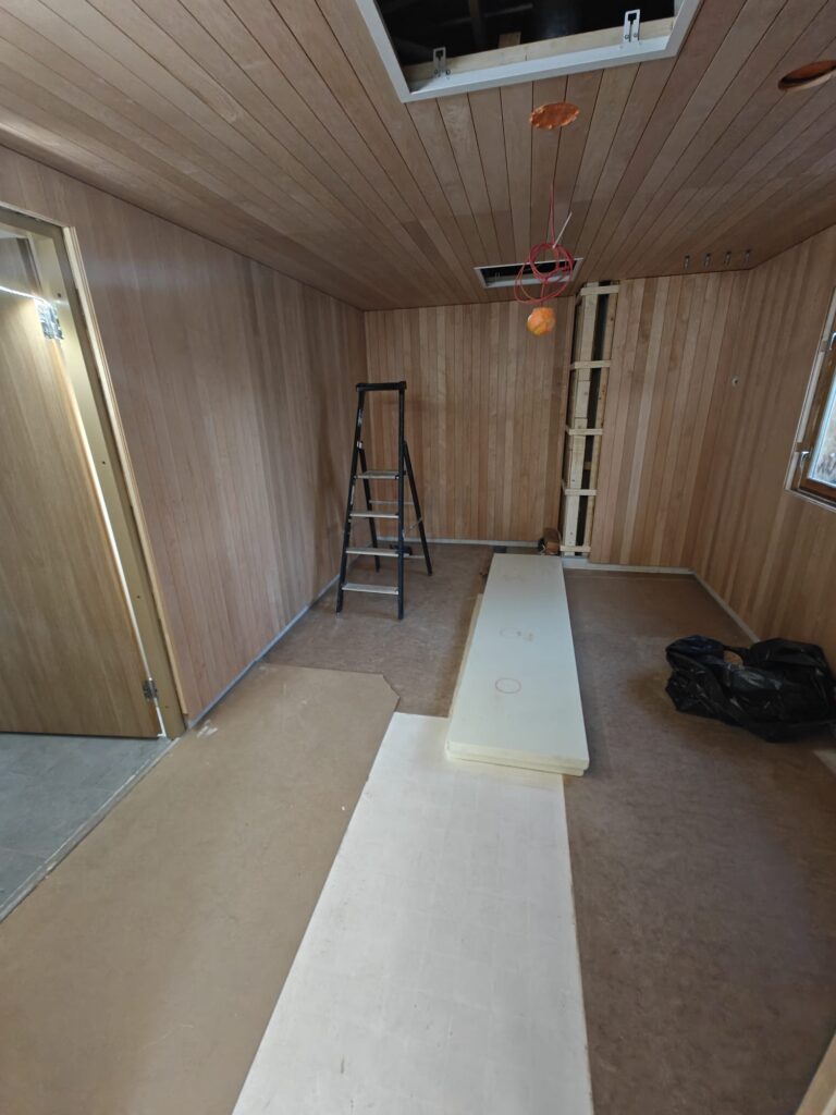 Kuudennessa kerroksessa terassityöt ovat jatkuneet. Myös terassilasit asennettu ja saunaosaston panelointia aloitettu. Kattoterassin laudoitus ja hissiaulan lattialaatoitus on saatu myös käyntiin.