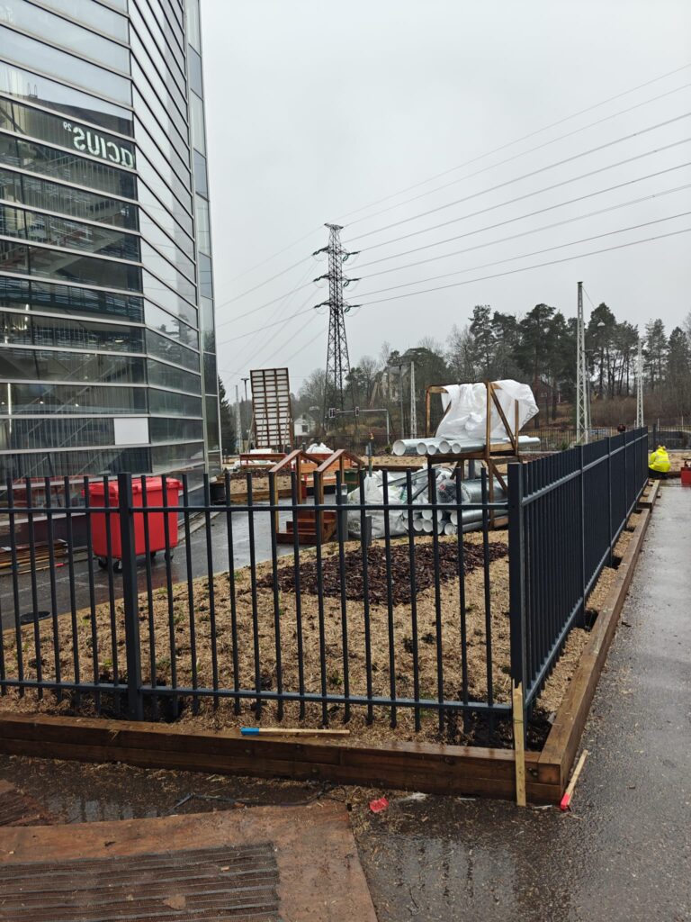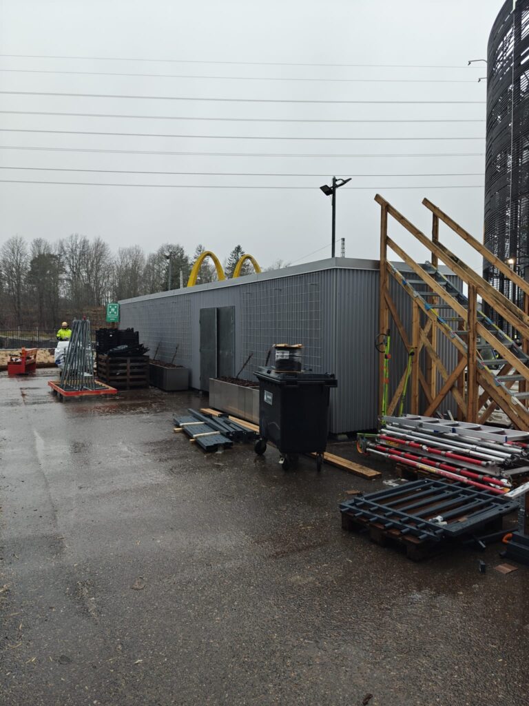 Piha-aidan asennus on aloitettu, ja jätekatoksen räystäspellit on saatu paikoilleen.
