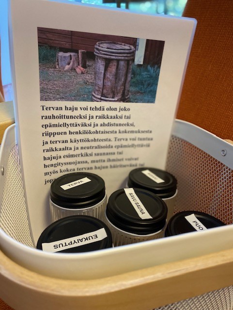 Huoneessa on myös kuulokkeet huonokuuloisempia asukkaita varten, jotta myös he pääsisivät kokemaan ääniä ja musiikkia. Aistihuoneesta löytyy lisäksi tuoksutarjotin, josta voi tuoksutella kauden mukaan vaihtuvia, muistoja herättäviä tuoksuja.