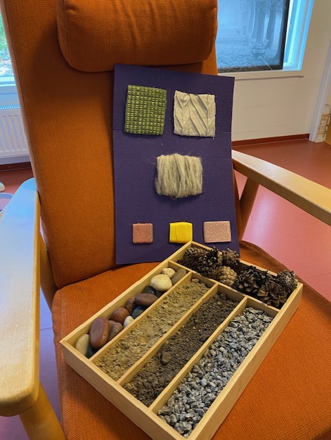 Tilasta löytyy monenlaisia mielenkiintoisia tunnusteltavia asioita, kuten pehmeitä kankaita ja villaa, hypistelymuhveja sekä aitoja, vaihtuvia luontoelementtejä, kuten käpyjä, kiviä, hiekkaa, soraa ja sammalta.