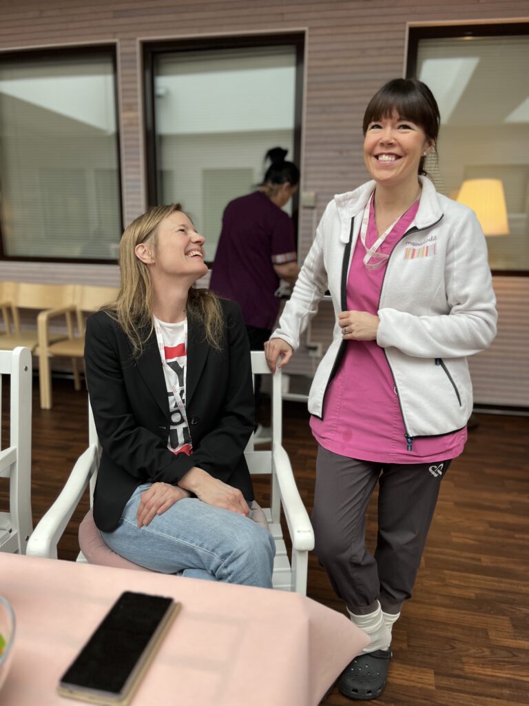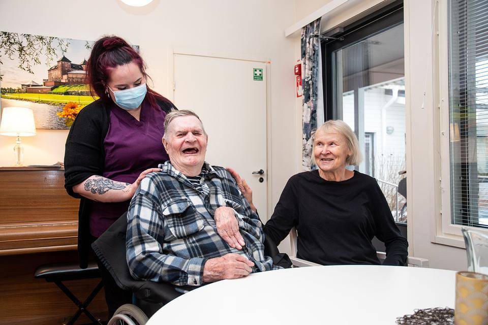 Vanhuuden kultaisina vuosina on lupa nautiskella – Mainiokoti Vanajassa asukkaan omaa tahtoa halutaan kunnioittaa 8.2.2023 Mainiokoti Vanajan asukkaan vaimo Raili käy katsomassa miestään usein ja viettää hänen kanssaan paljon aikaa. Talon puolesta huolenpitoa tarjoaa muiden muassa lähihoitaja Sarika Leppänen. Viimeisistä vuosista pitää saada nauttia. Näin pohtii Mainiokoti Vanajan yksikönjohtaja Paula Kemppinen vanhusten hyvän hoivan filosofiaa. – Konkreettisesti se näkyy esimerkiksi siinä, että aterioilla asukkaiden mielipiteitä kuunnellaan. Meillä ei ole ruokakortteja, joista katsottaisiin mitä kullekin tarjotaan. Pyrimme pitämään hoivan asukaslähtöisenä loppuun asti. Tietyssä elämänvaiheessa ei tarvitse enää miettiä kesäkuntoa. Jokainen kokenut hoitaja tietää, että asukkaan oman tahdon kunnioittaminen ja hänen oma paras etunsa eivät välttämättä aina kulje käsi kädessä. Pitkän uran akuuttihoidossa tehnyt sairaanhoitaja Minna Rantanen kertoo, että eettiset pohdinnat kuuluvat alalle. Hyvän hoitajan kuuluu kuitenkin ratkaista asiat vanhuksen parhaaksi, oli kyse sitten isoista tai pienistä asioista. – Emme voi esimerkiksi avata muistisairaalle asukkaalle ulko-ovea ei-aidatulle pihalle ilman saattajaa hänen oman turvallisuutensa vuoksi, Minna antaa esimerkiksi helposta ongelmasta. Vaikeammat kysymykset voivat liittyä vaikka hoitotahdon toteutumiseen. Hoitotahdolla tarkoitetaan sitä, millaista hoitoa asukas haluaa elämänsä loppuvaiheessa. Moni ei tätä välttämättä muista ajoissa miettiä, mutta hyvä olisi. Minna ja lähihoitaja Sarika Leppänen toimivat saattohoitovastaavina eli he tuovat uusimman tiedon yksikköön ja kehittävät saattohoitoa edelleen paremmaksi. Tärkeää on, että se asukkaan oma ääni tulee kuuluviin myös elämän loppuhetkillä, jos vain suinkin mahdollista. Eikä työ yleensä edes lopu siihen, kun lähtijälle koittaa viimeinen hetki. – Kun oma läheinen on poissa, omainen hakee monesti lohtua meistä hoitajista ja haluaa jutella muistakin elämän iloista ja suruista, mikä on hyvin ymmärrettävää, Sarika kertoo. Puolitoista vuotta talossa työskennellyt Minna oli niin tottunut hetkiseen akuutin hoidon ympäristöön, että rauhallisempaan työtahtiin piti oikein sopeutua. – Tässä ollaan lähempänä ihmistä. Hoitosuhteet ovat pitempiä, ja työ vaatii erilaista havainnointia, sillä usein asukas ei osaa kertoa, mikä on hätänä. Asioita pitää osata lukea nenänpään asennosta, Minna kuvailee. Kokeneen sairaanhoitajan Minna Rantasen mukaan suurimpia eroja vanhustyön ja akuuttihoitotyön välillä on se, että vanhustyössä suhde hoidettavan henkilön välillä on huomattavasti pidempi. Erilaiset työn vastuualueet ja työkaverien auttaminen ja perehdyttäminen tuovat kuitenkin sopivalla tavalla haastavuutta työhön. Onko Minna sitten työyhteisön äitihahmo? – Ennemminkin isosisko, hymyilee neljä vuotta talossa työskennellyt lähihoitaja Sarika, ja vilkaisee Minnan suuntaan. – Koska sun kanssa voi heittää läppää. Hyvän ja avoimen työyhteisön merkitystä ei voikaan liikaa korostaa monipuolisessa hoivatyössä. Kuuntelevan kollegan tuki on äärimmäisen tärkeä. Minna Rantanen ja Sarika Leppänen ovat Mainiokoti Vanajan saattohoitovastaavat. Kollegan tuki on tärkeää. Merkityksellinen työ Moni valitsee vanhustyön siksi, että siinä tuntee itsensä tärkeäksi. – Kasvan koko ajan ammatillisesti. Saan luottamusta ja uskon, että olen hyvä tässä. Ja oppiihan näiltä vanhuksista kaikkea, mitä historian kirjoista ei ole tullut opittua. Saan hyviä vinkkejä leipomisesta lähtien, Sarika kertoo. Merkitys omalle työlle syntyy Sarikan mukaan paljolti siitä, että saa toteuttaa toisen ihmisen pieniä toiveita, vaikkapa tuoda suklaata kaipaavalle vanhukselle hänen suosikkiherkkuaan. – Ja nämä ihmiset oikeasti ansaitsevat sen, että joku huolehtii, jatkaa Minna. Vaikka monella asukkaalla ei muisti pelaakaan, hoitajat kyllä tunnistetaan ja heitä tullaan halaaman. – Ja kysellään, että missä olen ollut, vaikka olisikin nähty vasta vartti sitten, Sarika naurahtaa. – No, tässähän minä. On hyvä, että voi olla jollekin sellainen tuttu ja turvallinen. Lue koko juttu Hämeen Sanomista täältä!
