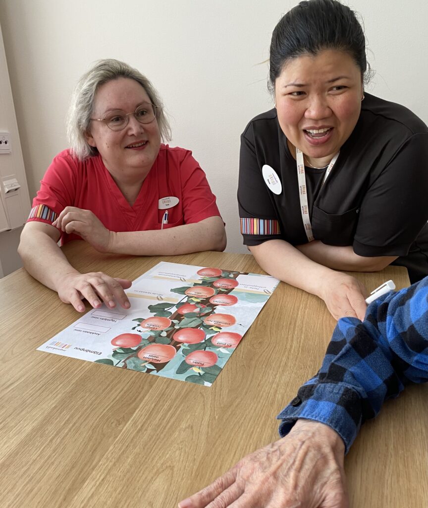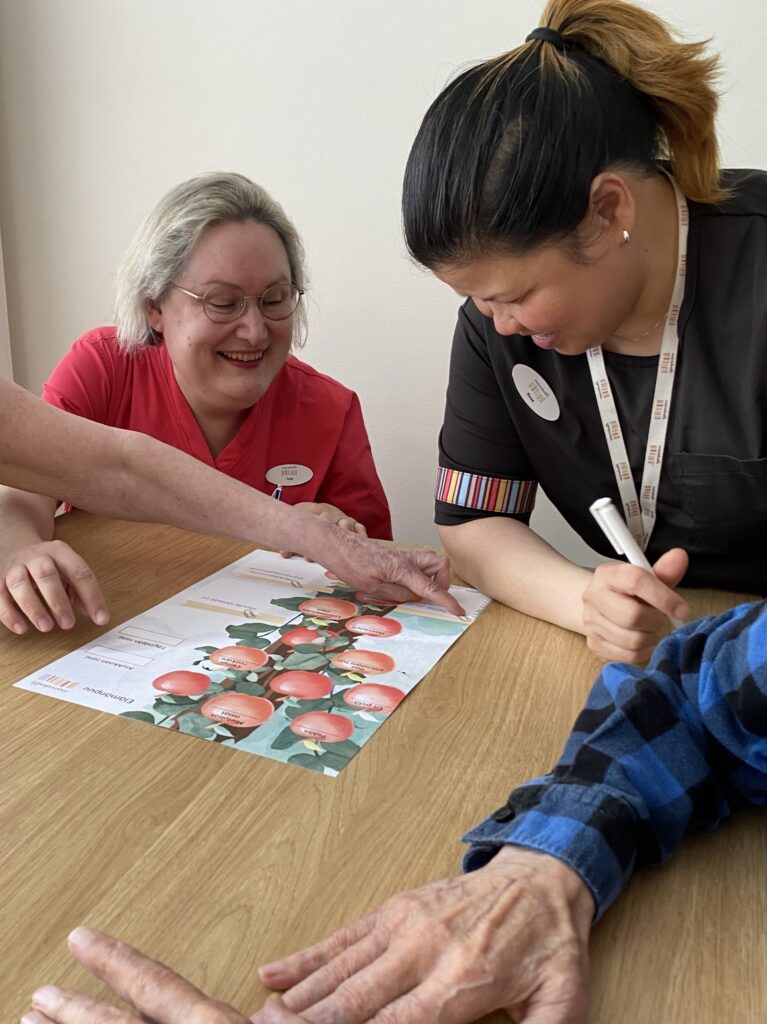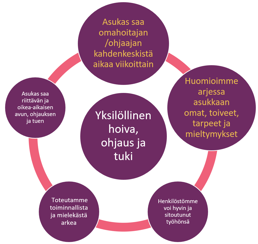 Mainiot Omahoitajat – Lupa tuntea 9.10.2024 Haluamme tuoda esiin hyvää työtä ja käytänteitä, jotka ovat jo yksiköissä käytössä. Lisäksi tavoitteena on syventää omahoitajan osaamista erilaisten koulutusten ja työkalujen avulla sekä tiivistää läheisyhteistyötä. Omahoitaja keskiöön – vuoden kärkihanke Omahoitajan merkitys on asukkaalle hyvin tärkeä – hän on asukkaalle tuki ja turva sekä henkilö, johon asukas voi luottaa ja joka tuntee asukkaan asiat hyvin. Omahoitajuus on laatutyön keskiössä. Omahoitaja on keskeisessä roolissa esimerkiksi hoito- ja kuntoutussuunnitelmien laadinnassa, RAI-toimintakykyarvioinneissa ja läheisyhteistyössä. Lupa tuntea on tunnuslause, joka tiivistää vuoden kärkihankkeen tarkoituksen. Meillä on lupa tuntea asukkaiden historia, elämäntarina ja toiveet. Meillä on lupa tuntea niitä tunteita, mitä elämään ja asukkaan kodin elämään liittyy. Myös läheisillä on oikeus tutustua asukkaan omahoitajaan, ymmärtää omahoitajan rooli ja tietää, missä asioissa he voivat olla yhteydessä omahoitajaan. Vuoden 2023 lopulla tehtiin yksiköiden työntekijöille Mainiot Omahoitajat -kysely (n=293), jossa kartoitettiin omahoitajan tärkeimpiä tehtäviä sekä toiveita omahoitajan tehtävässä onnistumiseen. Omahoitajan tärkeimpinä tehtävinä kyselystä nousi yhteistyö asukkaan läheisten kanssa, muiden hoitajien pitäminen ajan tasalla omaan asukkaaseen liittyvissä asioissa, asukkaan kokonaisvaltaisesta hyvinvoinnista huolehtiminen, asukkaan tukeminen ja lähellä olo sekä varmistus asukkaan tahdon toteutumisesta. Omahoitajan tehtäviin liittyviä onnistumisia koettiin, kun asukkaan ja läheisten toiveet tiedettiin ja ne toteutuivat arjessa. Lisäksi onnistumisia koettiin, kun tiedettiin omahoitajuuteen liittyvät odotukset. Syksyllä 2023 toteutettiin vuosittainen läheiskysely, jonka vastausten mukaan henkilökunta oli hyvin tavoitettavissa, ja viikoittaisten kuulumisten kertominen keräsi kiitosta. Kaikki läheiset eivät tienneet kuka on asukkaan omahoitaja. Varmistamme jatkossa, että kaikki läheiset tietävät kuka on asukkaan omahoitaja ja varaomahoitaja. Elämänpuu-juliste on yksi omahoitajan työkaluista ”Omatuokiot tekevät kodistamme Mainion” Asukkaan yksilöllisen ja henkilökohtaisen hoivan toteutumisen ytimessä on vahva ja luottamuksellinen asukas-omahoitajasuhde. Kun omahoitaja on asukkaan hoidon ja hoivan asiantuntija, hänen ja asukkaan sekä läheisten kesken syntyy vahva luottamuksellinen side. Näin jokaisen asukkaan yksilölliset tarpeet huomioidaan arjessa. Omahoitajuuden keskiössä ovat omatuokiot, jotka ovat omahoitajan ja asukkaan välistä kahdenkeskistä aikaa, joka vietetään asukkaan toivomalla ja hänelle merkityksellä tavalla. Kahden ihmisen arvostava kohtaaminen vahvistaa asukkaan myönteistä kokemusta itsestään ja omasta merkityksellisyydestään. Tärkeintä omatuokioissa on aito läsnäolo ja asukkaan toiveiden toteutuminen. ”Omatuokiot tekevät kodistamme Mainion”Anton Paavola, Mainiokoti Lehtisaari | Mainiot Omahoitajat -kysely Kaikki kohtaamiset asukkaan ja läheisten kanssa antavat työntekijöille työkaluja asukkaan mieltymysten löytämiseen. Asukkaan tunteminen auttaa myös tunnistamaan yhteisiä mielenkiinnon kohteita, jotka auttavat luomaan merkityksellisiä omatuokioita. Omatuokioiden avulla asukas tulee nähdyksi ja kuulluksi omana itsenään. Omatuokioita ovat esimerkiksi mielimusiikin kuuntelu, vanhojen aikojen muistelu valokuvien avulla, asukkaan asioista puhuminen yhdessä asukkaan kanssa ja mieluisten videoiden katsominen tabletilta tai televisiosta. Omatuokioissa voi hyödyntää myös henkilökunnan vahvuuksia, joita voivat olla laulaminen, maalaaminen, pelaaminen ja esiintyminen. Jokaisessa Mainiokodissa on luotu asiakastyön hyveet, joita voi myös hyödyntää osana omatuokioita. ”Omahoitajuuden kautta syntyvä luottamus asukkaan ja minun välillä sekä läheisten luottamus siihen, että heidän läheisellään on arvokas vanhuus, on hyvin palkitsevaa.”Satu Gumpler, Mainiokoti Siiri | Mainiot Omahoitajat -kysely Jokaisessa Mainiokodissa on luotu asiakastyön hyveet, joita voi myös hyödyntää osana omatuokioita. Laatulupaukset omatuokioiden taustalla Laatulupaukset toimivat Mainiokodeissa kaiken tekemisen pohjalla ja myös omatuokioiden taustalla. Mainiokotien päämääränä on asukkaan yksilöllinen hyvä elämä ja se toteutuu, kun toteutamme laatulupauksia ja elämme kodin päivää yhdessä asukkaiden kanssa. Yksilöllinen hyvä elämä muodostuu viidestä laatulupauksesta, jotka ovat Yksilöllinen hoiva, Ohjaus ja tuki, Turvallisuus, Oma viihtyisä koti, Yhteisöllisyys ja osallisuus sekä Maukas ja terveellinen ravinto. Jokainen laatulupaus muodostuu viidestä osasta, joten laatulupauksia voidaan sanoa olevan yhteensä 25. ”Tämä on asukkaiden koti. On hyvin tärkeää, että läheiset ja asukkaat ovat tyytyväisiä ja iloisia.”Mai Le, Mainiokoti Wanha Lahti | Mainiot Omahoitajat -kysely Yksilöllinen hoiva, ohjaus ja tuki Laatulupauksessa lupaamme, että asukas saa omahoitajan/-ohjaajan kahdenkeskistä aikaa viikoittain ja että asukkaan omat toiveet, tarpeet ja mieltymykset huomioidaan arjessa. Laatulupausten toteutumista arjessa mittaamme laatuindeksikyselyllä, jonka avulla saamme asukkaiden, henkilöstön ja läheisten kokemukset näkyviin. ”Omatuokion ei tarvitse olla rakettitiedettä. Tärkeintä on huomioida asukas ja tietää hänen historiastaan vähän. Katsekontakti ja selkeä kommunikointi ja läheisyys!”Anonyymi avoin vastaus | Mainiot Omahoitajat -kysely Työkaluja omahoitajalle Keväällä 2024 Mainiokotien työntekijöille pidettiin hankkeen infotilaisuus sekä kaksi Mainiot Omahoitajat -koulutusta. Koulutuksissa on korostettu omahoitajuuden merkitystä, kuultu omahoitajien haastattelut sekä tuotu työntekijöiden käyttöön työkaluja, jotka ovat apuna omahoitajuuden toteuttamisessa. Kevään ens