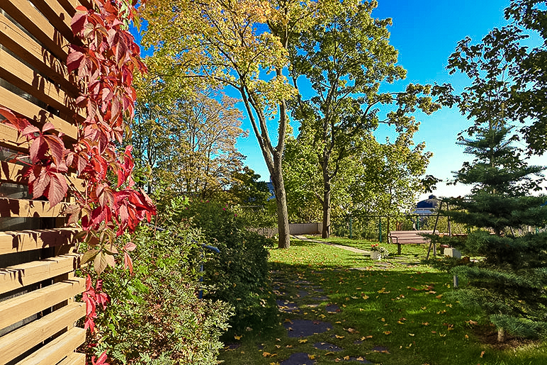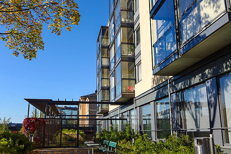 Ympäristö on vehreää ja jalankulkuväylät tarjoavat hyvät mahdollisuudet liikkumiseen myös apuvälineiden käyttäjille.