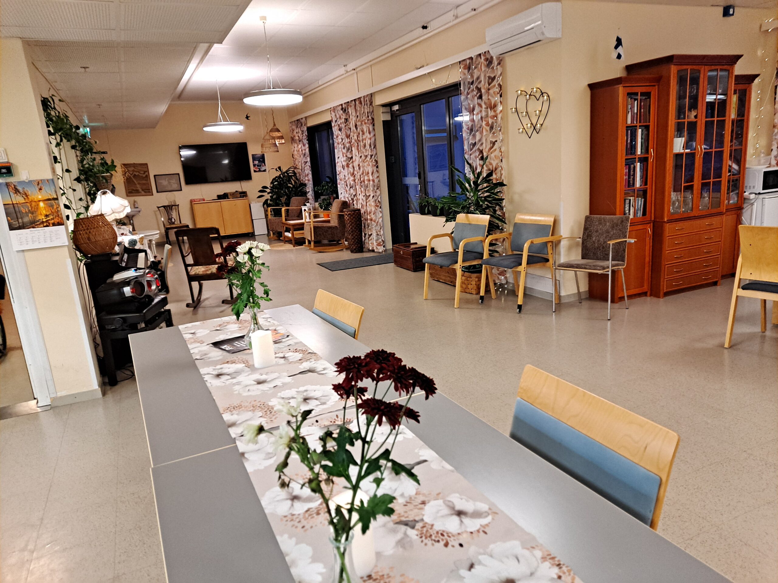 Palvelukodissa on asukkaille yhteiset viihtyisät oleskelu-, keittiö-, ruokailu- ja saunatilat sekä terapia-/kuntoilutila. Asukkaamme voivat oleskella, liikkua ja toimia apuvälineiden kanssa esteettömästi ja turvallisesti kaikkialla palvelukodin alueella, sekä sisä- että ulkotiloissa.