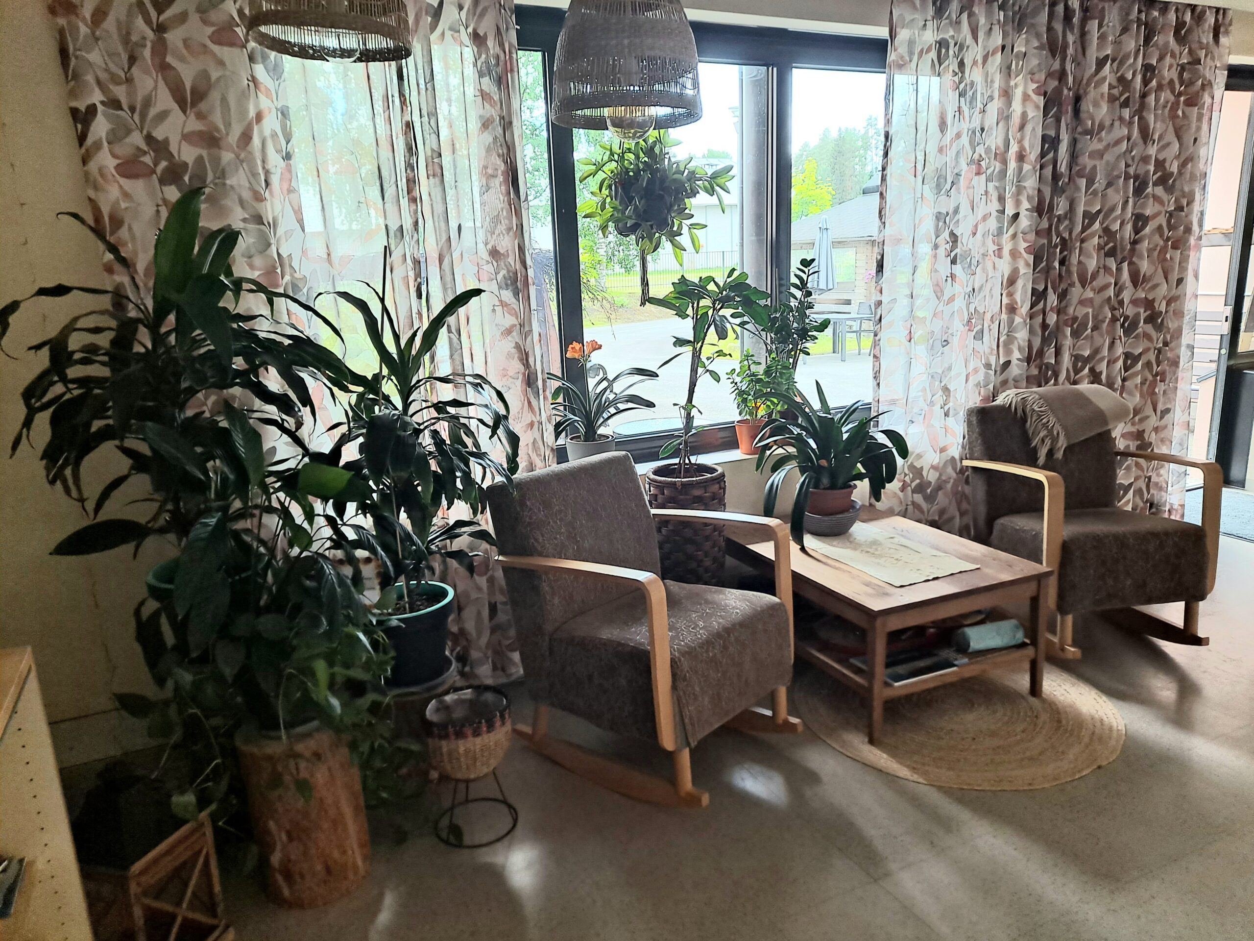 Omasta huoneestaan asukas voi sisustaa viihtyisän ja kodikkaan, omilla huonekaluillaan ja rakkailla valokuvilla. Jokaisessa ryhmäkodissa on yhteinen olohuone, ruokailua, yhdessäoloa ja arjentoimintaa varten. Juhlapyhät näkyvät meidän sisustuksessamme, luoden kotiimme lisää viihtyisyyttä. Avaralla ja aurinkoisella takapihallamme ulkoilemme ympäri vuoden. Grillikatoksessa paistuvat makkarat makoisat ja kesäisin muurinpohjapannulla myös letut maukkaat.