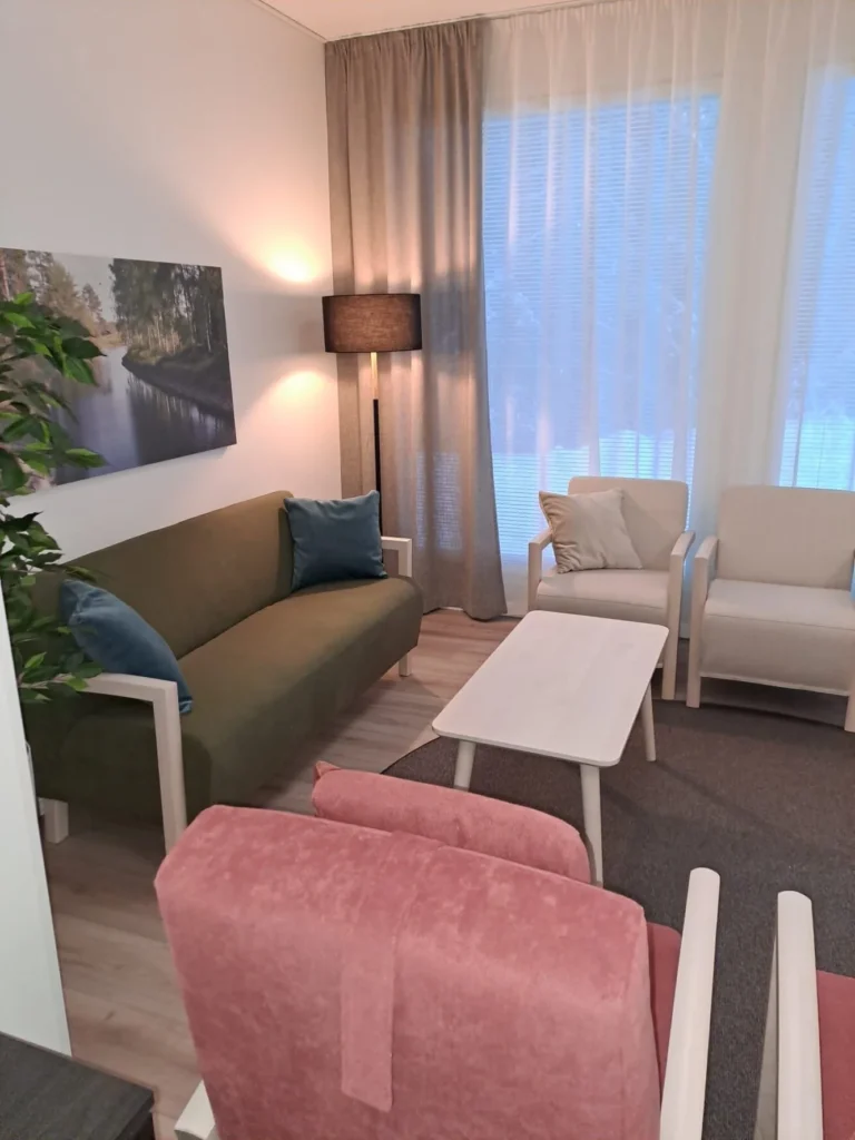 Mainiokoti Metsänhelmi Rahkakatu 34, 70780 Kuopio Toimipaikkatyyppi: Meillä on vapaita asukaspaikkoja Voit kysellä asukaspaikkoja ottamalla yhteyttä yksikönjohtajaan. Jonna Korhonen 050 307 2441 Yhteystiedot Yksikönjohtaja Jonna Korhonen 050 307 2441 Jonna.K.Korhonen@mainiokodit.fi Tiimivastaava Nimi Inka Falkenbach Puhelin 050 342 6550 (arkisin klo 8-14) Email inka.falkenbach@mainiokodit.fi Palvelujohtaja Santtu Harjulehto, Keski- ja Itä-Suomi 040 353 0715 santtu.harjulehto@mainiokodit.fi Sairaanhoitaja Nimi Anne Korhonen Puhelin 050 309 1374 Email anne.korhonen5@mainiokodit.fi Hoitajat Puhelin 050 308 9667 (24/7) Puhelin 050 307 8216 (Kielo) Puhelin 050 308 6125 (Kallio) Osoite Osoite Rahkakatu 3470780 Kuopio Kodin esittely 32-paikkainen kotimme on avannut ovensa asukkaille tammikuussa 2023 Kuopiossa. Mainiokoti Metsänhelmessä asukkailla on oma yksityinen huone, ja päivät viihdytään yhteisissä tiloissa oman jaksamisen mukaan. Meillä Jynkässä eletään arkea ja juhlaa kuten kotona eletään, kaikkine iloine ja säröineen. Meillä saa tarpeiden mukaista ympärivuorokautista hoivaa. Ihminen saa olla, tehdä, syödä, levätä, kohdata, tuntea, muistaa ja unohtaa. Meillä on vierailuaika aina. Tervetuloa kylään! Osaava, koulutettu ja välittävä henkilöstö Monipuolista toimintaa Ympärivuorokautista hoivaa Esteettömät tilat Kaunis luonto ja ympäristö Hyvät kulkuyhteydet Palvelut ja toiminta Toiminta-ajatus Näin asut meillä Kodit ja yhteistilat Vapaa-aika ja järjestetty toiminta Tulo-ohjeet Kodin ympäristö Meille asukkaaksi Palautteet asukkailta ja läheisiltä Toiminta-ajatus Mainiokoti Metsänhelmi sijaistee Kuopion Jynkässä rauhallisella omakotitaloalueella metsän laidassa. Metsämaisema avautuu ikkunoista ja linnunlaulu herättää uuteen aamuun. Meillä jokainen ihminen kohdataan lämminhenkisesti, sydämellisesti ja ihmisen ainutkertaisuutta arvostaen. Henkilökunnalla on vahvaa osaamista ja koulutusta muistisairaan kohtaamisesta, joka vahvistaa asukkaan yksilöllisten tarpeiden huomioimisen ja tukemisen. Moniammatillinen yhteistyö varmistaa, että asukkaamme saavat hoitoa ja tukea kokonaisvaltaisesti eri alojen ammattilaisten yhteistyönä. Yhdessä tekeminen, inhimillisyys ja aitous ovat keskeisiä toimintaperiaatteitamme. Hoitotyön eettiset arvot, kunnioitus, itsemääräämisoikeus ja vahva ammattitaito ohjaavat meitä laadukkaan hoitotyön toteuttamisessa. Kodissamme tärkeitä arvoja ovat vuorovaikutteisuus, turvallisuus ja luottamuksellisuus. Olemme aidosti läsnä ja luomme positiivisia ja merkityksellisiä kohtaamisia joka päivä. Työyhteisössämme vallitsee iloinen ja rento ilmapiiri, jossa myös huumorille annetaan tilaa. Meillä jokainen saa olla oma itsensä. Kodissamme puhutaan, kuunnellaan ja ymmärretään. Meidän omaksi mietelauseeksemme onkin muodostunut ”meillä puhutaan savvoo, hilijoo ja kovvoo”. Jokainen kertomus eletystä elämästä ja kokemuksista on tärkeä ja elämäntarinan ymmärtäminen auttaa hoitajia luomaan syvällisempiä yhteyksiä asukkaiden kanssa. Tarjoamme mahdollisuuksia toiminnalliseen ja osallistavaan arkeen, jokaisen voimavarat ja mieltymykset huomioiden. Henkilökuntamme on läsnä arjen jokaisessa hetkessä, niin iloissa, kuin suruissakin. Kodissamme on tärkeää, että jokainen ihminen saa elää omannäköistä elämää. Meillä läheisiä kuunnellaan ja arvostetaan yhteisessä päätöksenteossa. Yhteistyön perustana ovat osallisuuden ja yhteisöllisyyden vahvistaminen. Jokainen elämäntarina on ainutlaatuinen ja tärkeä. Mainiokoti Metsänhelmessä luodaan lisää yhteisiä kokemuksia ja muistoja. Löydät kotimme yhteystiedot alta; olisipa ihanaa, jos olet yhteydessä. Toiminta ajatus Toiminta-ajatus Mainiokoti Metsänhelmi sijaistee Kuopion Jynkässä rauhallisella omakotitaloalueella metsän laidassa. Metsämaisema avautuu ikkunoista ja linnunlaulu herättää uuteen aamuun. Meillä jokainen ihminen kohdataan lämminhenkisesti, sydämellisesti ja ihmisen ainutkertaisuutta arvostaen. Henkilökunnalla on vahvaa osaamista ja koulutusta muistisairaan kohtaamisesta, joka vahvistaa asukkaan yksilöllisten tarpeiden huomioimisen ja tukemisen. Moniammatillinen yhteistyö varmistaa, että asukkaamme saavat hoitoa ja tukea kokonaisvaltaisesti eri alojen ammattilaisten yhteistyönä. Yhdessä tekeminen, inhimillisyys ja aitous ovat keskeisiä toimintaperiaatteitamme. Hoitotyön eettiset arvot, kunnioitus, itsemääräämisoikeus ja vahva ammattitaito ohjaavat meitä laadukkaan hoitotyön toteuttamisessa. Kodissamme tärkeitä arvoja ovat vuorovaikutteisuus, turvallisuus ja luottamuksellisuus. Olemme aidosti läsnä ja luomme positiivisia ja merkityksellisiä kohtaamisia joka päivä. Työyhteisössämme vallitsee iloinen ja rento ilmapiiri, jossa myös huumorille annetaan tilaa. Meillä jokainen saa olla oma itsensä. Kodissamme puhutaan, kuunnellaan ja ymmärretään. Meidän omaksi mietelauseeksemme onkin muodostunut ”meillä puhutaan savvoo, hilijoo ja kovvoo”. Jokainen kertomus eletystä elämästä ja kokemuksista on tärkeä ja elämäntarinan ymmärtäminen auttaa hoitajia luomaan syvällisempiä yhteyksiä asukkaiden kanssa. Tarjoamme mahdollisuuksia toiminnalliseen ja osallistavaan arkeen, jokaisen voimavarat ja mieltymykset huomioiden. Henkilökuntamme on läsnä arjen jokaisessa hetkessä, niin iloissa, kuin suruissakin. Kodissamme on tärkeää, että jokainen ihminen saa elää omannäköistä elämää. Meillä läheisiä kuunnellaan ja arvostetaan yhteisessä päätöksenteossa. Yhteistyön perustana ovat osallisuuden ja yhteisöllisyyden vahvistaminen. Jokainen elämäntarina on ainutlaatuinen ja tärkeä. Mainiokoti Metsänhelmessä luodaan lisää yhteisiä kokemuksia ja muistoja. Löydät kotimme yhteystiedot alta; olisipa ihanaa, jos olet yhteydessä. Näin asut meillä Kodin voi sisustaa ja kalustaa omannäköisekseen. Kaikissa huoneissa on valmiina hoivasänky sekä e